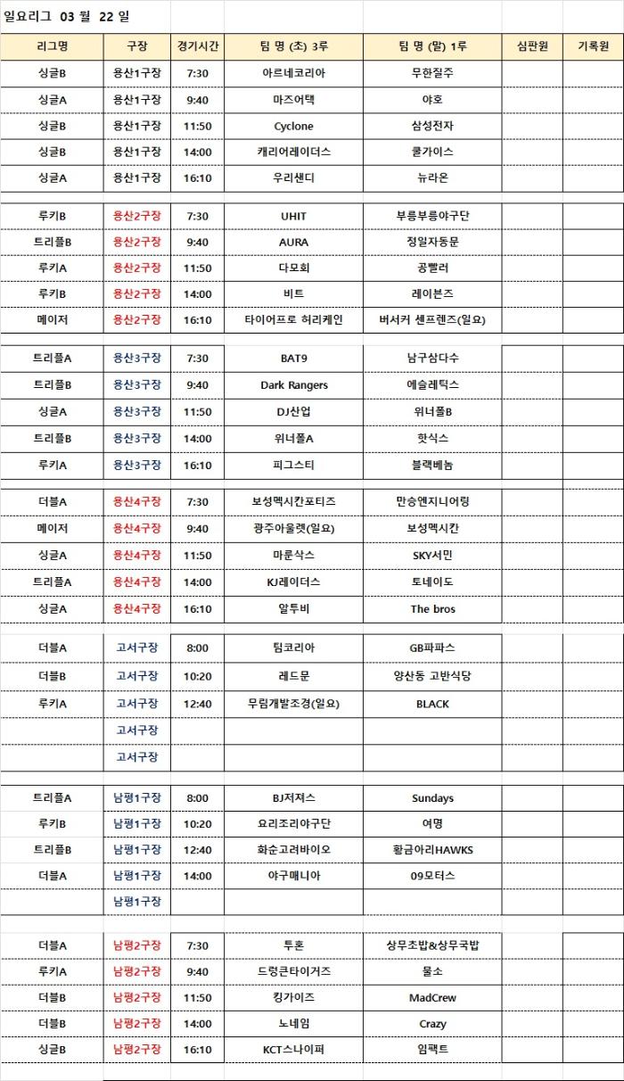3월22일(일) 경기일정